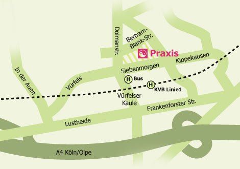Die Praxis liegt mitten im Refrather Zentrum (Eingang vom Peter-Bürling-Platz). Es stehen ausreichend Parkplätze zur Verfügung. Sie können uns auch mit der Bahnlinie 1 und den Buslinien 451 und 452 erreichen.